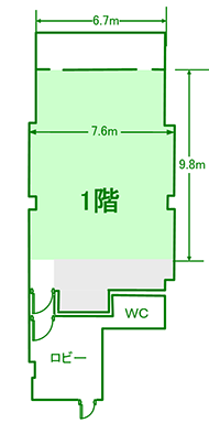 約7.6m×9.8m=約75m²(ロビースペースあり/トイレ独立)